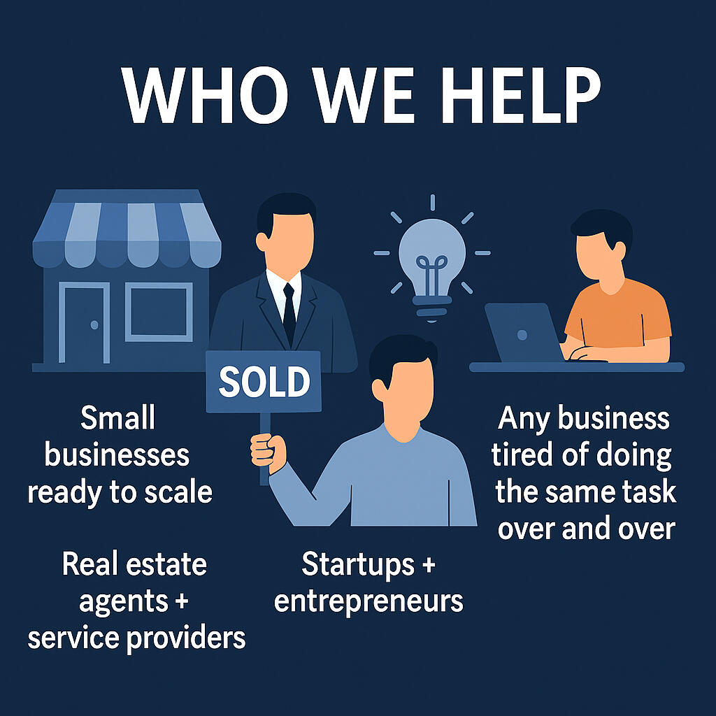 ✔ Small businesses ready to scale✔ Real estate agents + service providers✔ Startups + entrepreneurs✔ Any business tired of doing the same task over and over